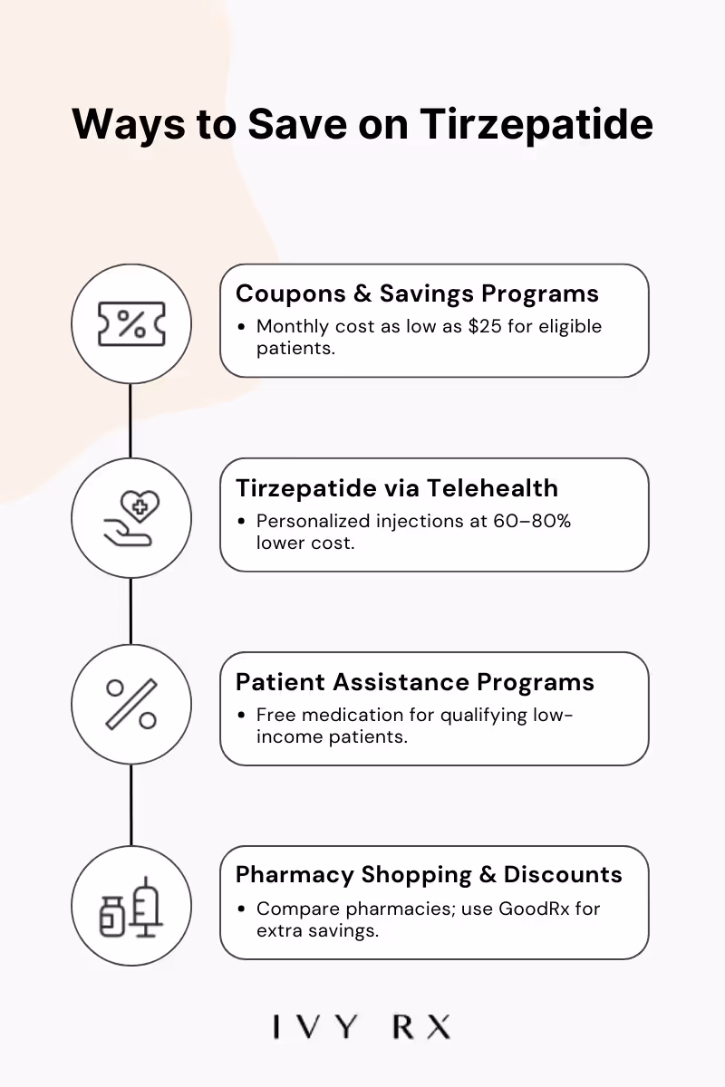 GoodRx and similar platforms offer additional discount opportunities, though savings remain limited given tirzepatide's premium pricing structure.