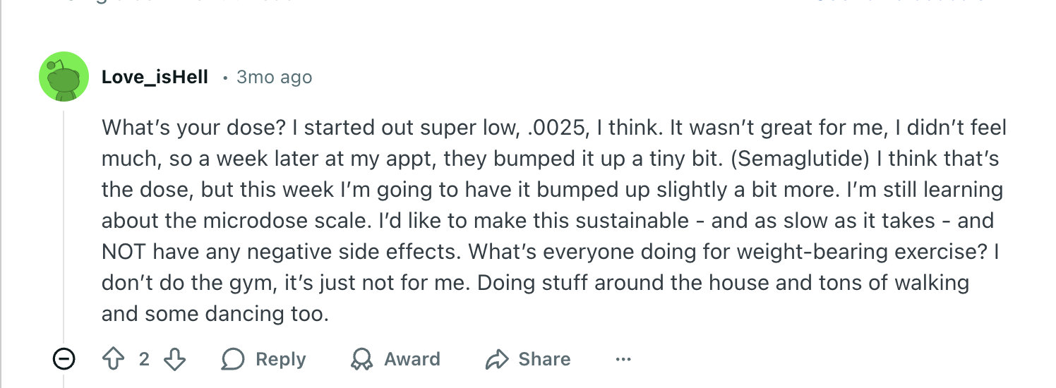 One Reddit user wanted to avoid side effects altogether. She started semaglutide at 0.0025mg, which is a very low dose.