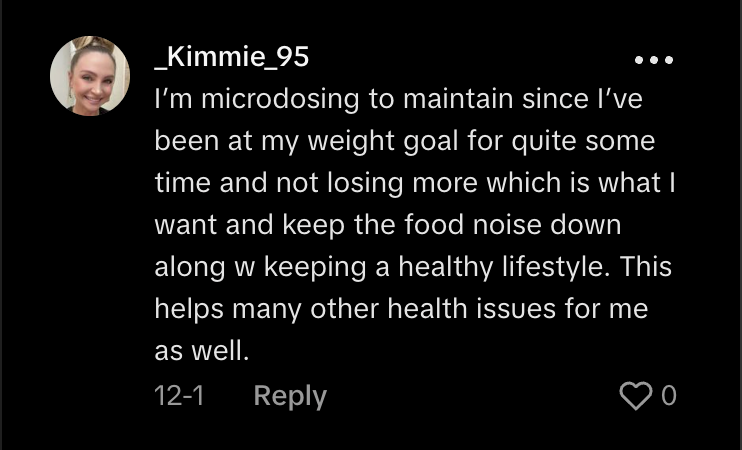 “I’m microdosing to maintain since I’ve been at my weight goal for quite some time and not losing more, which is what I want and keep the food noise down, along with keeping a healthy lifestyle. This helps many other health issues for me as well.”