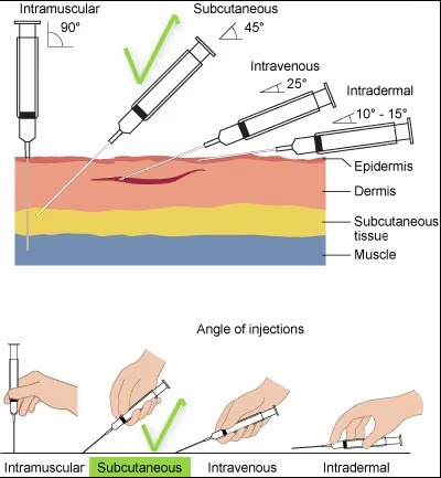 - Pinch a fold of skin, insert the needle at a 45–90° angle, and inject slowly.